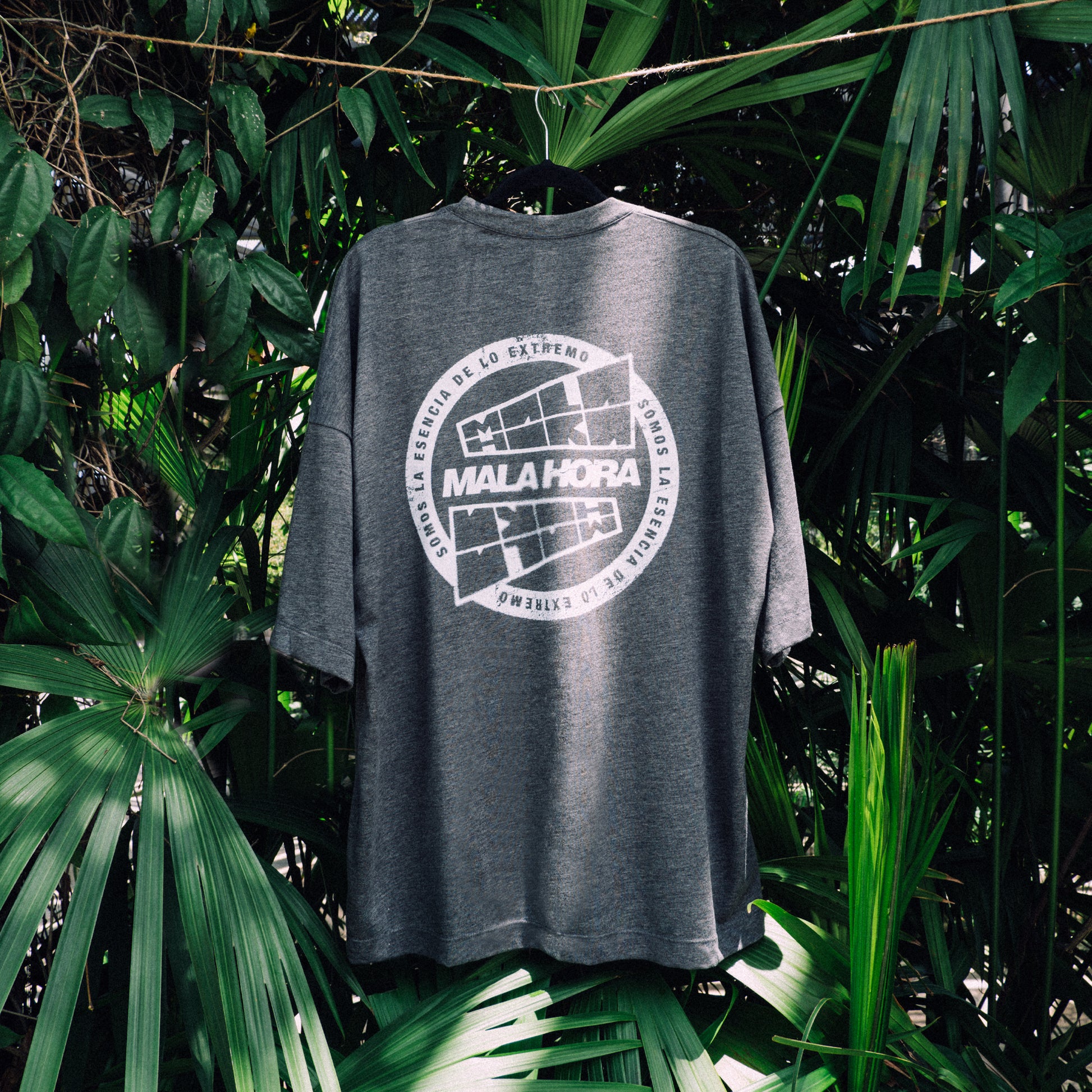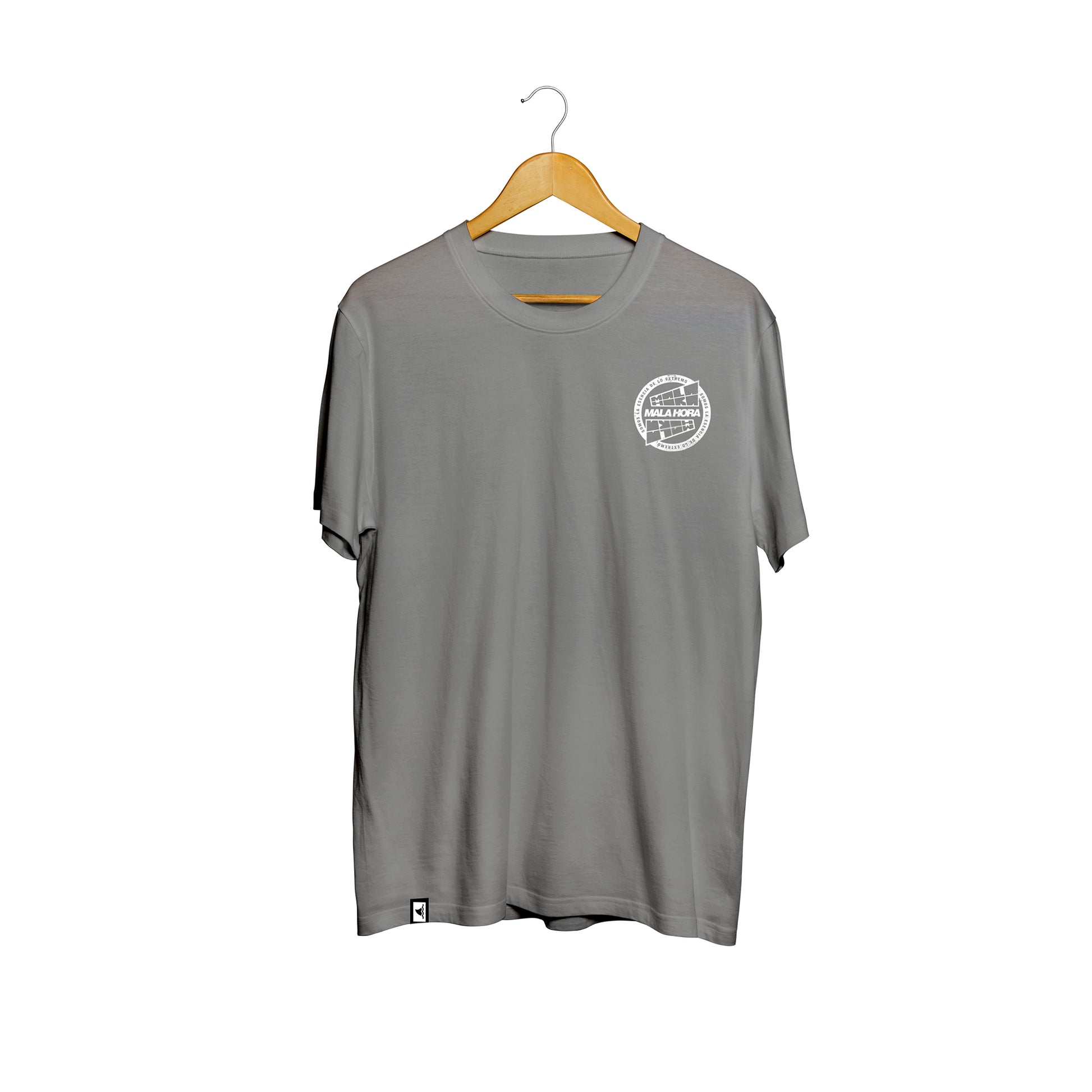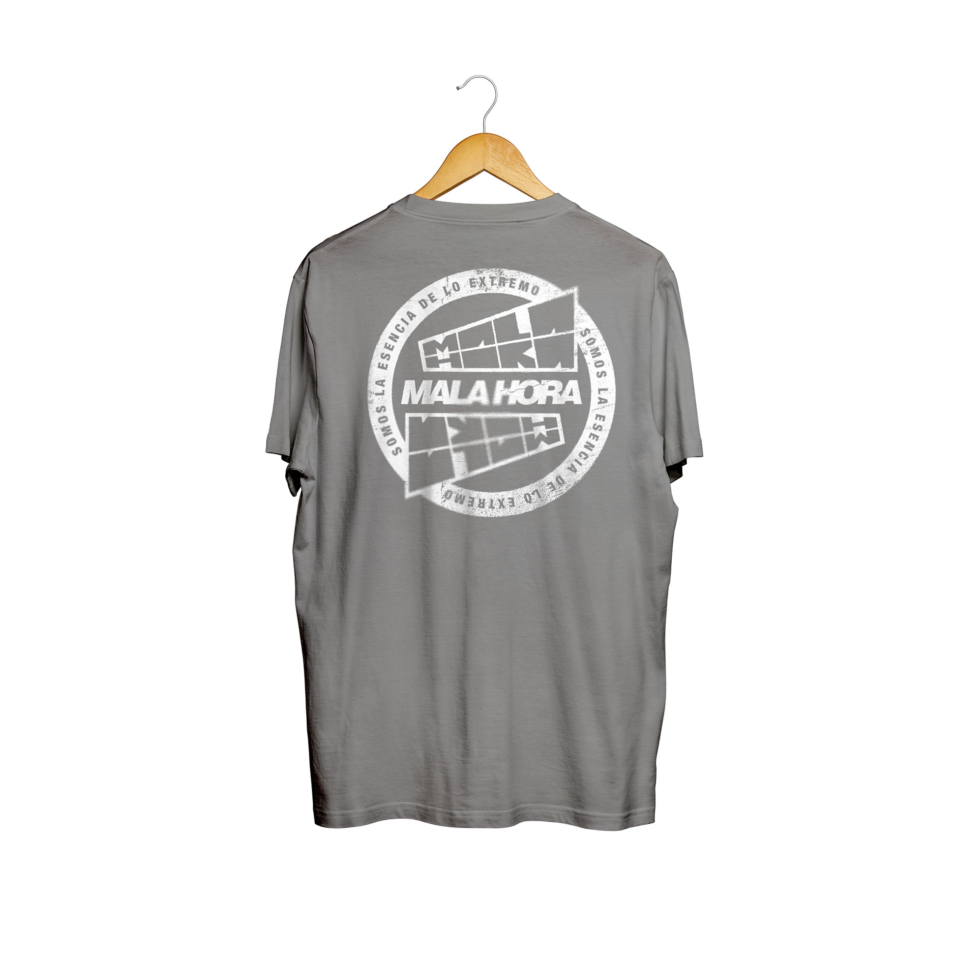 Camiseta con estampado frontal en dtf, logo Mala Hora Society. Estampado en la espalda en dtf, diseño Impronta.